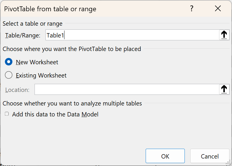 In the dialog that pops up, you can set if you want the PivotTable to show up on a new worksheet or on an existing worksheet. For this tutorial, keep “New Worksheet” checked.