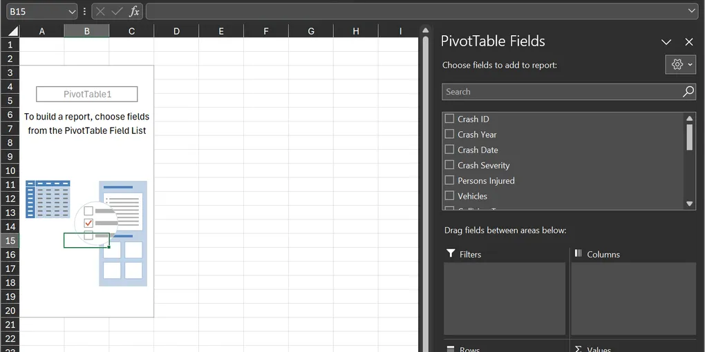 For this simple PivotTable, we’ll just count the number of records in the source data. Start by dragging the Crash ID field from the top area (B) to the Values area (F).